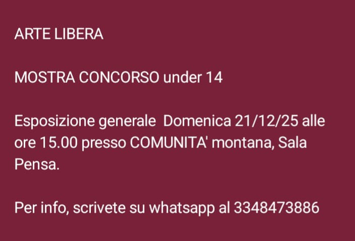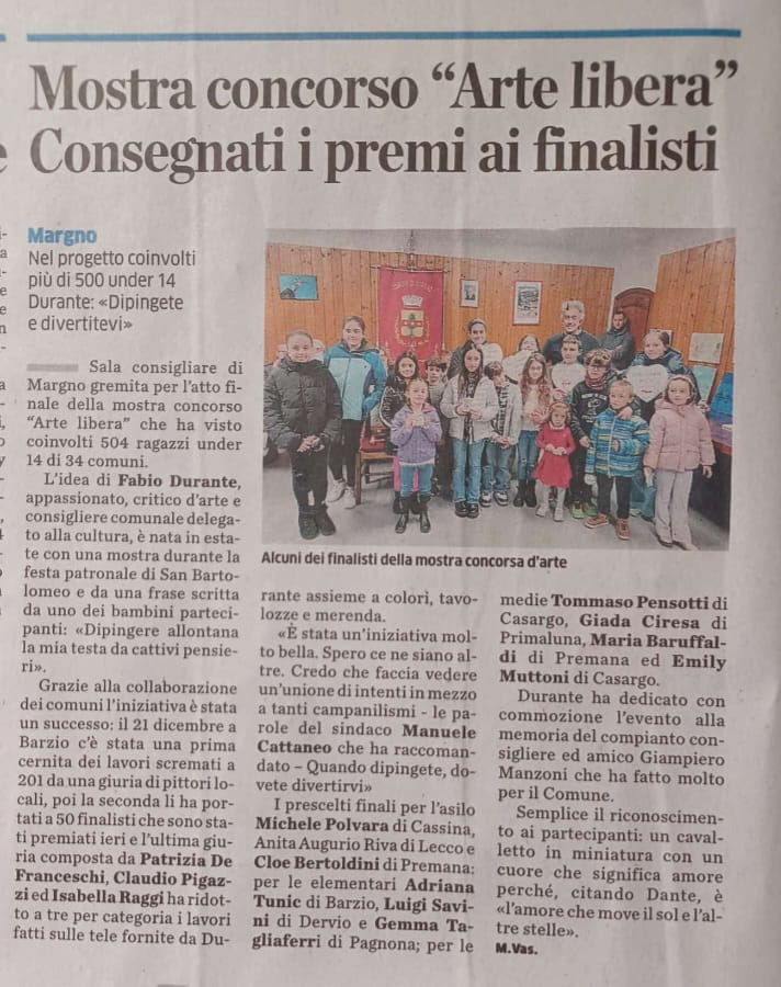 ragazzi. L'esposizione di tutti i quadri è prevista per Domenica 21 Dicembre ore 15.00 presso Comunità Montana (il Parlamentino delle Valli) in Sala Pensa. Finale a Margno il 27
